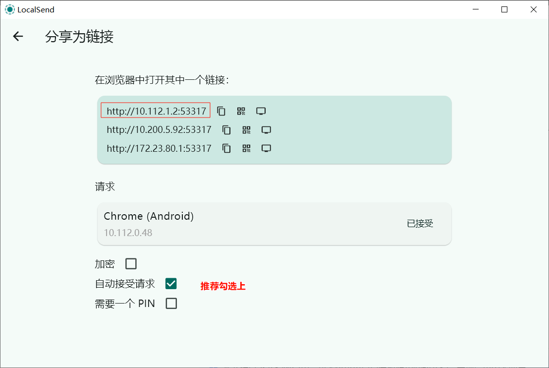 对于给陌生设备传文件这事,LocalSend 的通过链接分享功能也解决了这个问题,毕竟给陌生设备,尤其不是自己的设备上安装第三方软件这件事情本身,就是不安全和不礼貌的。