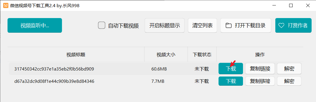 登录电脑微信 打开上面的应用,微信视频号下载工具 2.4.exe 点击 2 个按钮:开始监听,开启标题显示 电脑微信上刷短视频 下载工具会自动列出刚才刷到的短视频 下载,就可以直接在电脑上观看