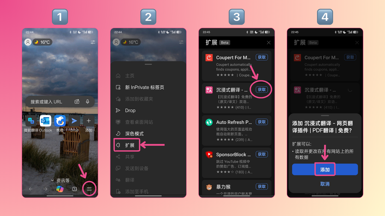 • 打开 Edge → 右下角菜单(三横) → 扩展