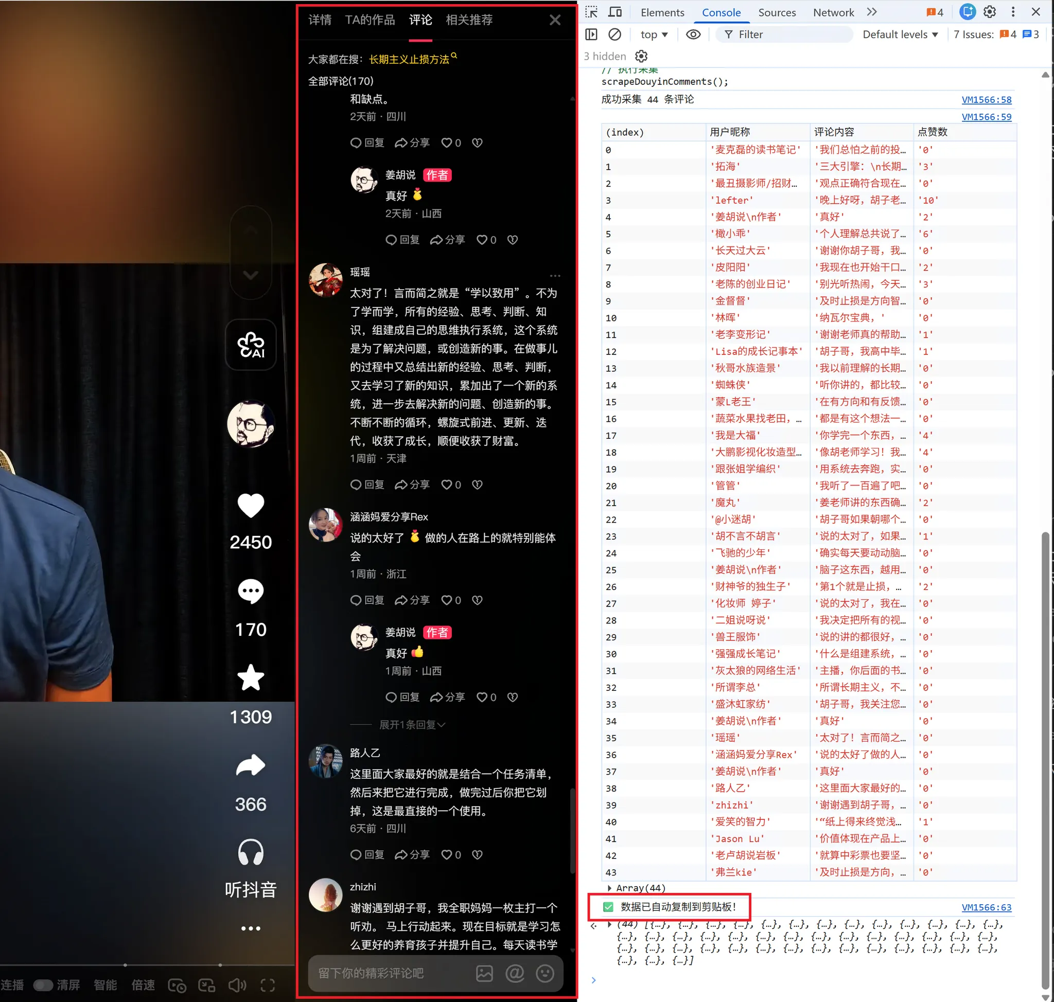 // 注意:抖音评论区是懒加载的,运行前请手动向下滚动加载更多评论