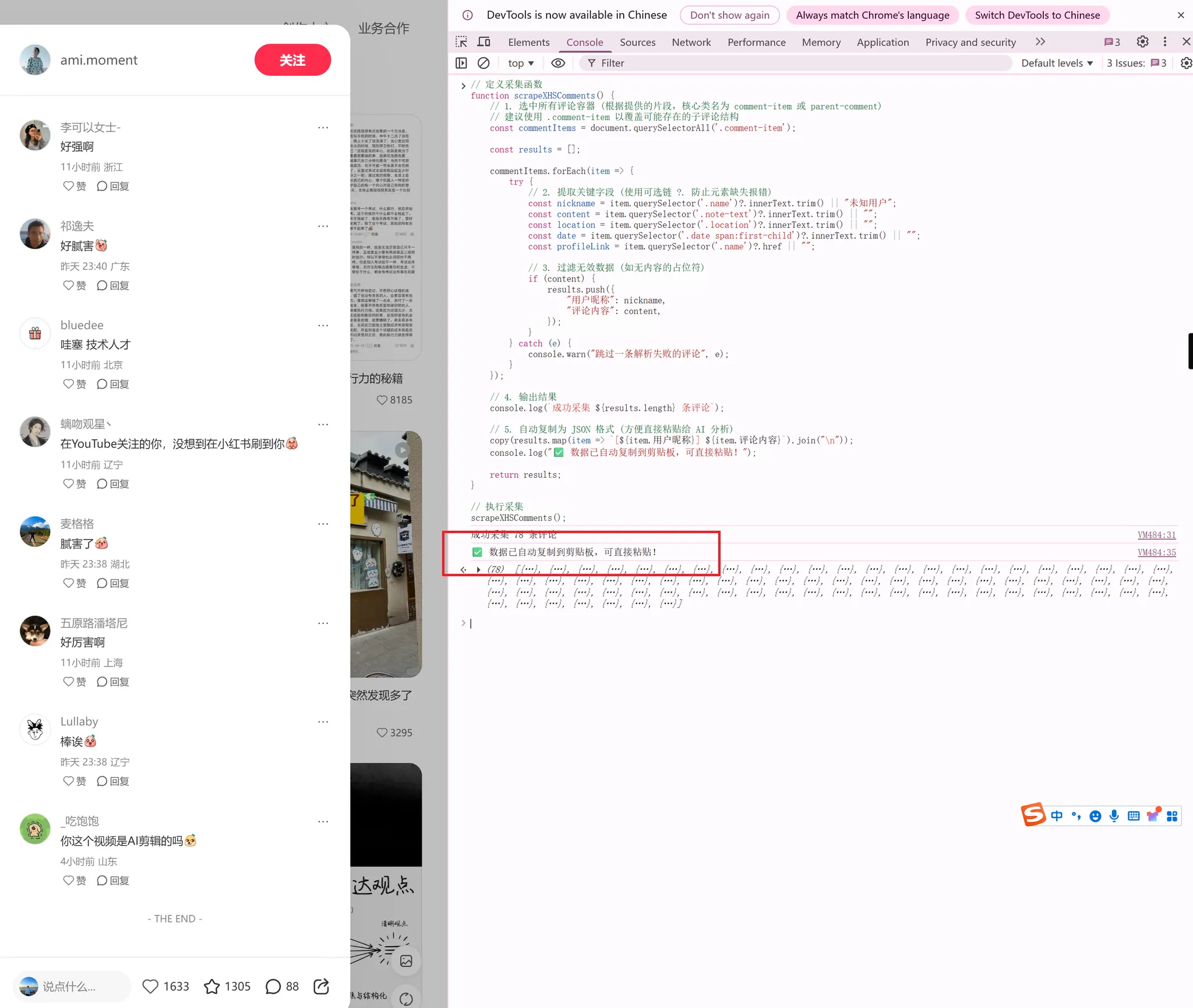然后把对应代码粘贴到 console,按回车键执行,评论就自动复制到剪切板了