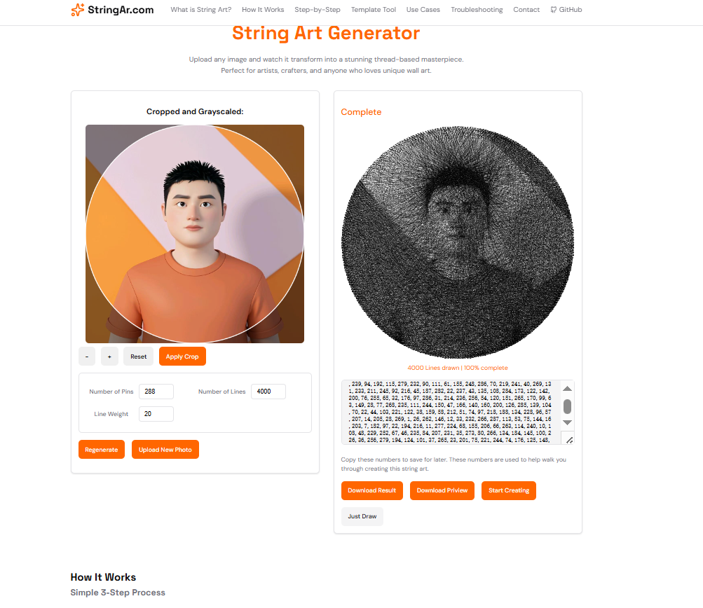 String Art 是一种用钉子和线创作的艺术形式,通过在特定位置缠绕线条来呈现图像。传统方法需要大量计算和试错,这个工具来自动化整个过程。