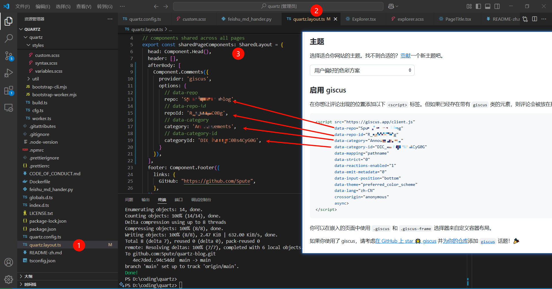 light-theme.css、dark-theme.css)放置于quartz/static/giscus/目录。 - 在配置中指定主题路径与文件名:
