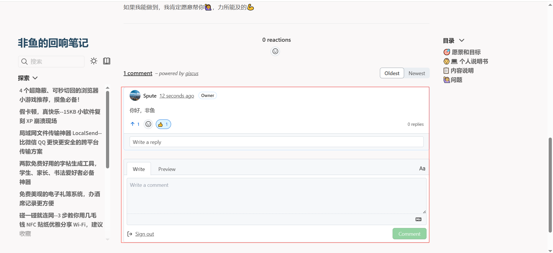 Quartz 原生支持 Giscus,这是一个基于 GitHub Discussions 的开源评论工具。Giscus 利用 GitHub 账号体系,无需额外注册,并将评论数据直接存储在 GitHub Discussions 中,管理方便且配置简单。实际体验中,整个配置过程顺利,效果也令人满意。