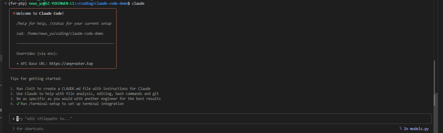 source ~/.bashrcANTHROPIC_AUTH_TOKEN:使用前面生成的 API KeyANTHROPIC_BASE_URL:固定为https://anyrouter.top