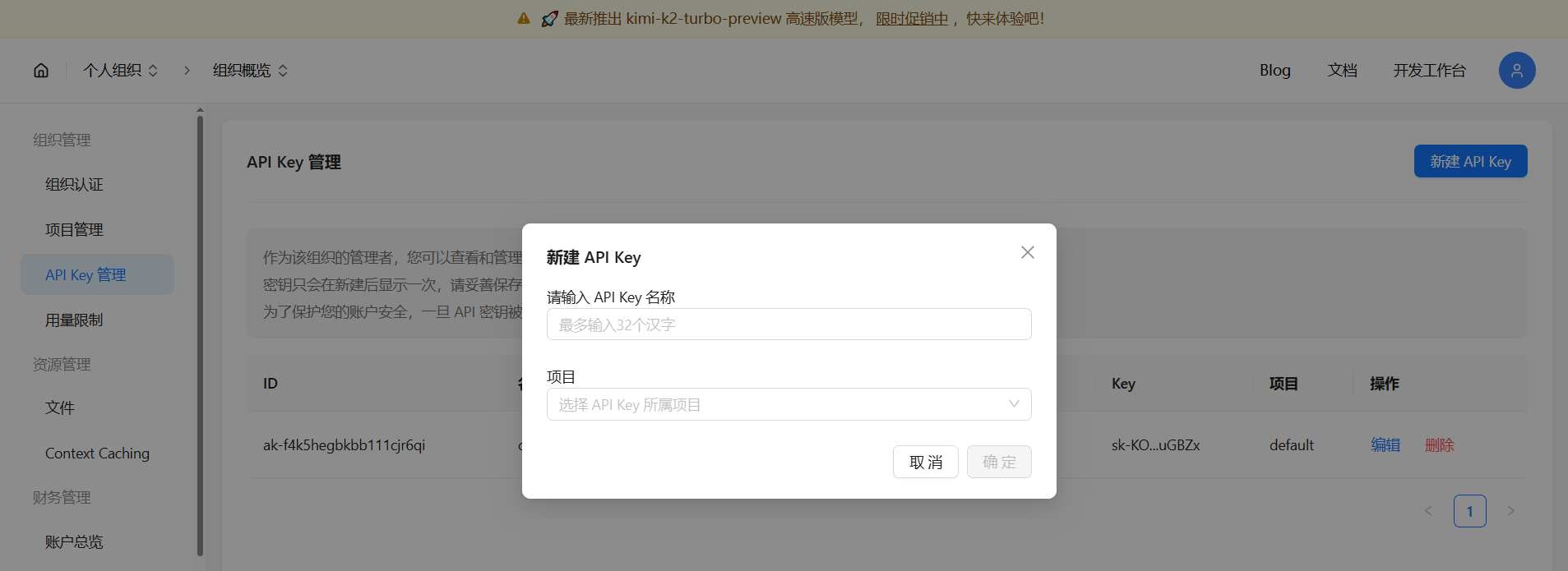 点击新建 API Key 的蓝色按钮,名称随便写,项目选择默认即可。