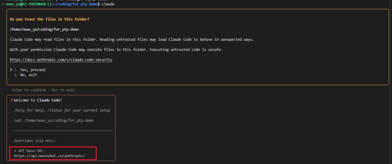 在命令行输入 claude,发现使用了 kimi 的请求地址,表示配置成功