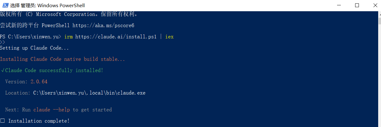 以管理员身份打开 PowerShell,执行以下命令并等待完成。当出现 “Installation complete!” 即表示安装成功: