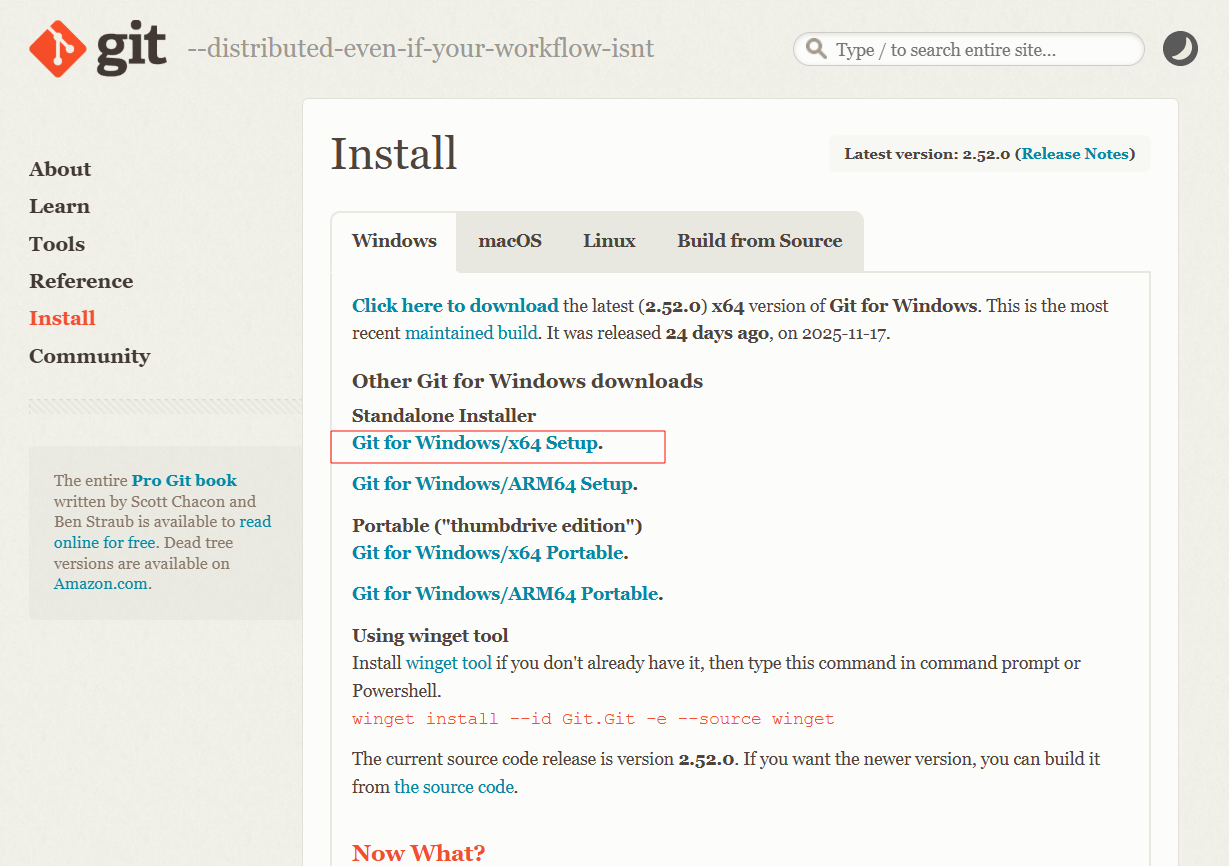 这个工具对git有依赖,所以需要先下载,点击网站 Git for Windows,找到对应版本下载(一本电脑都是x64内核),如下图,然后运行安装即可。