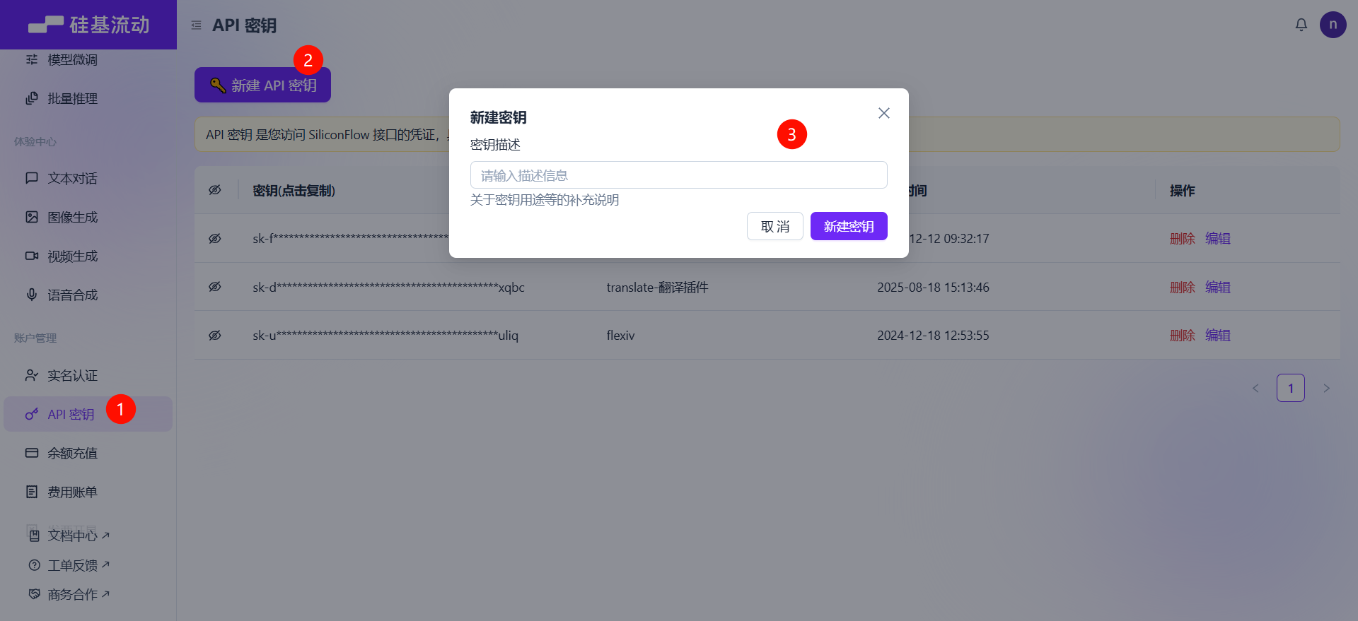 登录https://cloud.siliconflow.cn/me/account/ak ,创建保存你的 API Key