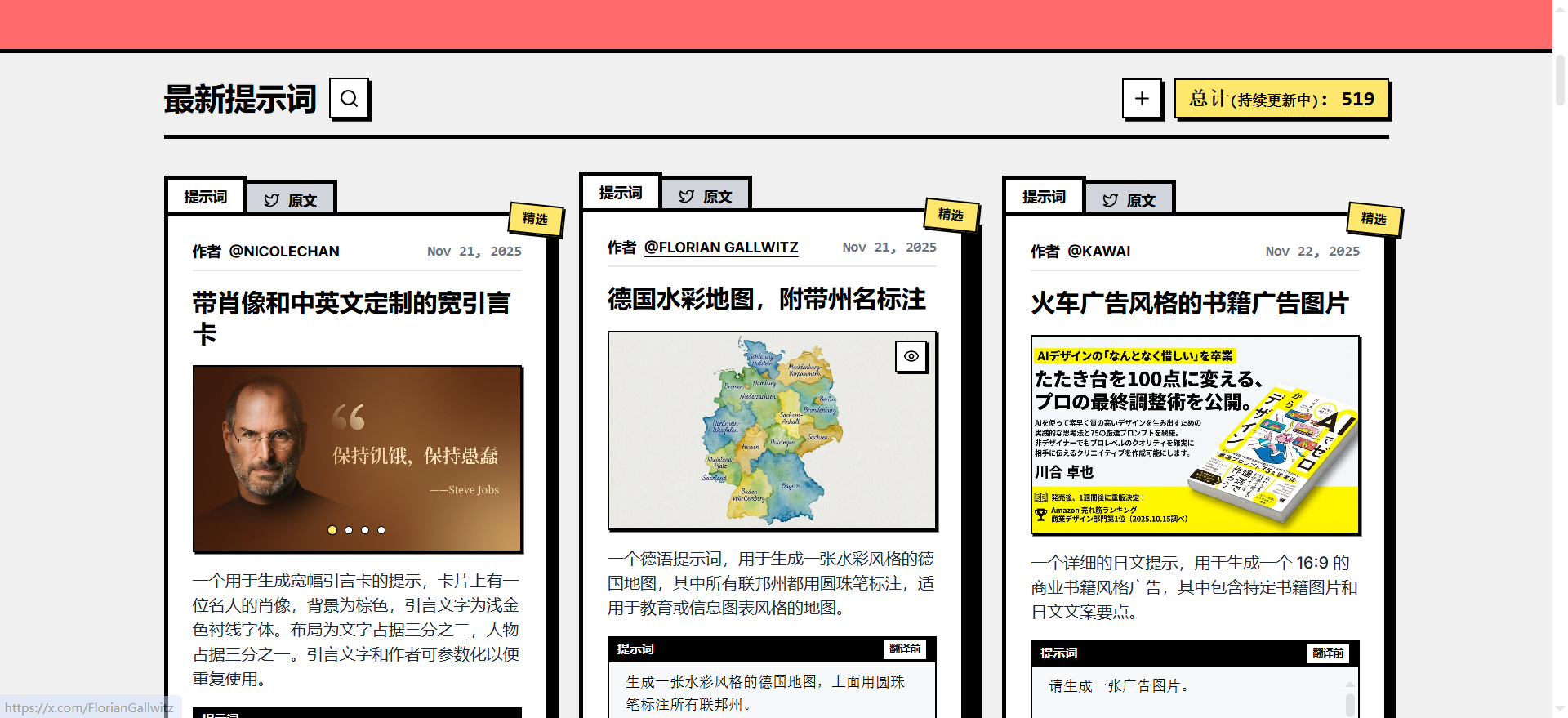这个仓库收集了550的 Nano Banana Pro 模型提示词,每一个提示词都有图片,超过一半提示词带有参数。